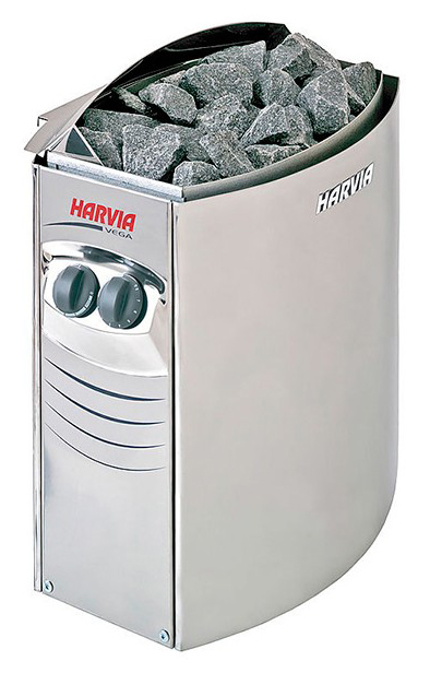 Harvia 3,5 kw é fácil de instalar. Só tem de instalar a base da parede, levantar a bandeja no meio e fixar com um parafuso. O aquecimento é de aço inoxidável.