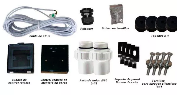 Com a aquisição da bomba de calor Tonga vêm uma série de artigos incluídos para a sua correta instalação. Entre estes artigos podemos ver um cabo de 10 metros, um pulsador, saco com parafusaria, 4 tampões, quadro de controlo remoto, controlo remoto de montagem em parede, 2 racords, suportes de parede e 4 parafusos para bloqueio silencioso.