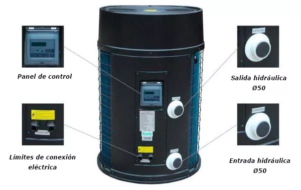 Um dos acessórios que incorpora o modelo Tonga é o seu trocador de titânio PVC compatível com cloração salina. Por outro lado, também podemos contar com um descongelamento automático de 4 vias acelerado.