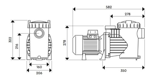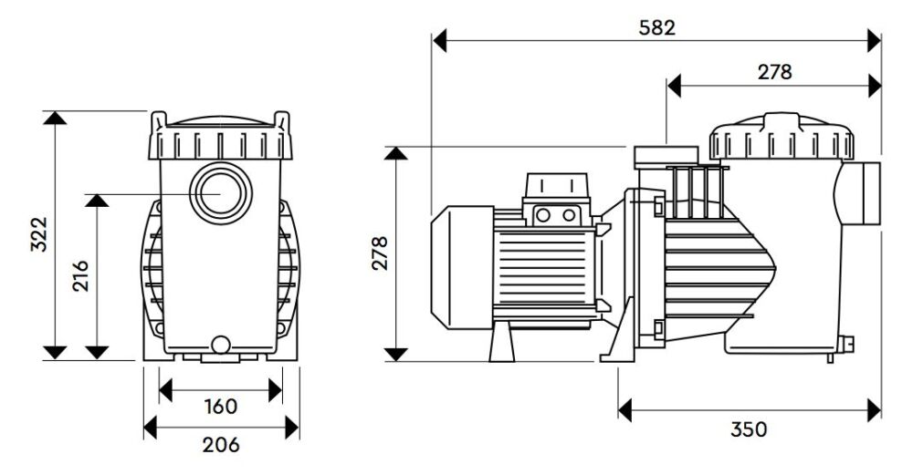 No seguinte desenho, podemos ver todas as medidas da bomba de filtração. As dimensões estão indicadas em milímetros (mm).
