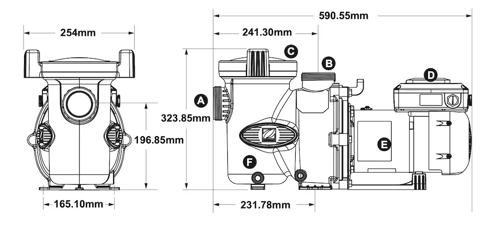 A bomba de filtração Zodiac E30 iQ apresenta um design compacto com dimensões claramente definidas para facilitar a sua instalação. Em vista frontal, o equipamento tem uma largura total de 254 mm e uma base de 165,10 mm, enquanto a sua altura atinge os 323,85 mm, com uma altura do corpo principal de 196,85 mm. Em vista lateral, o comprimento total da bomba é de 590,55 mm, incluindo o motor, com um comprimento do corpo hidráulico de 231,78 mm e uma distância superior de 241,30 mm até à tampa do pré-filtro. Estas medidas permitem um planeamento correto do espaço necessário para a sua montagem e manutenção.