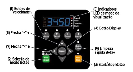 A luz LED ativada em qualquer de esses parâmetros indica a informação que se amostra no ecrã. Em caso de que a luz pisque significa que o parâmetro está sendo editado. Os parâmetros que se amostram são: Speed (velocidade de funcionamento atual), Time (hora atual do dia), Duration (quantidade de tempo restante), Watts (quantidade de watts consumidos).