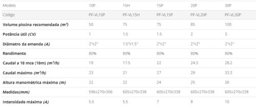 Na tabela seguinte poderá comparar os diversos modelos de bomba e as suas especificações. A nossa recomendação é que escolha o produto que melhor se adapte às dimensões da sua piscina.