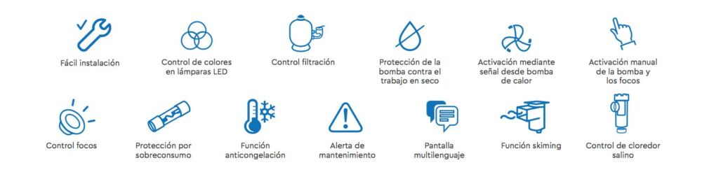 Inclui de série as máximas proteções para a bomba, inclui relógios programadores de filtração, entradas e saídas para o sistema de luzes, sonda de temperatura PT100. Os controladores para piscinas ajudam-nos a manter tudo perfeitamente alinhado, controlado e organizado para que possamos desfrutar mais da piscina sem ter que pensar em quase nada.