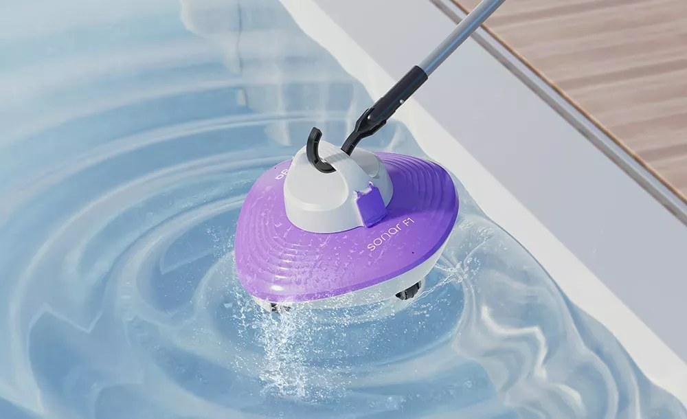 O modelo Sonar 10 limpa o fundo total de piscinas até um máximo de 6 metros de comprimento. Pesa apenas 3,2kg e vem acompanhado de um gancho para facilitar a recolha da água.