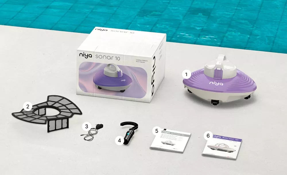O aspirador Niya Sonar 10 está desenhado para ser compacto, leve e fácil de manipular. Tem um sistema que permite parar automaticamente no fundo da parede da piscina, quando acaba a bateria ou o ciclo de limpeza, para que o possa recolher. Conta com filtração fina, o que captura resíduos pequenos.