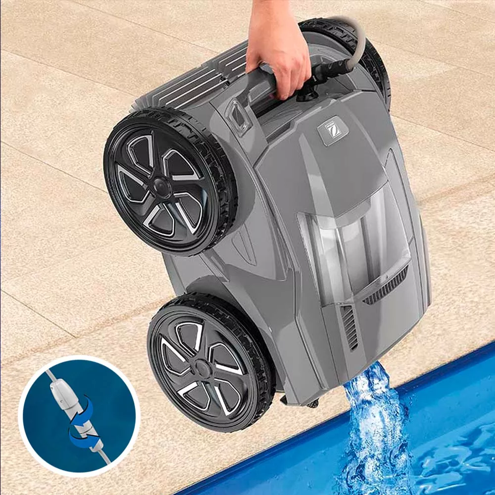 O sistema Lift System patentado pela Zodiac, reduz o peso do aspirador ao retirar da água. Vai subir pela parede e ficar na linha de água; ao pegar pela asa, a água cai para uma fácil extração.