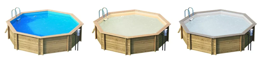 A piscina de madeira Odyssea octogonal pode ser adquirida nas diferentes cores de borda e liner disponíveis: borda Havana + liner Azul, borda Havana + liner Bege e borda Cinza Costa + liner Cinza claro.