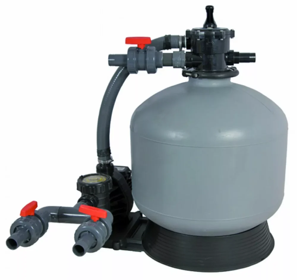Sistema de filtração de areia de 9,1 m3/h com válvula de 6 vias e bomba de água com pré-filtro.